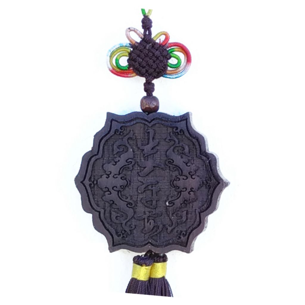 Blazing sun shaped sandalwood charm with etched image of Guan Yin, on cord with knot and tassel