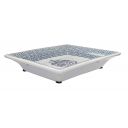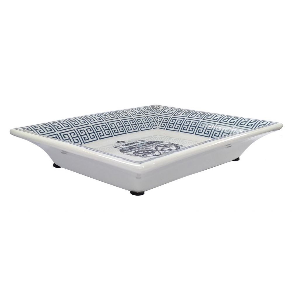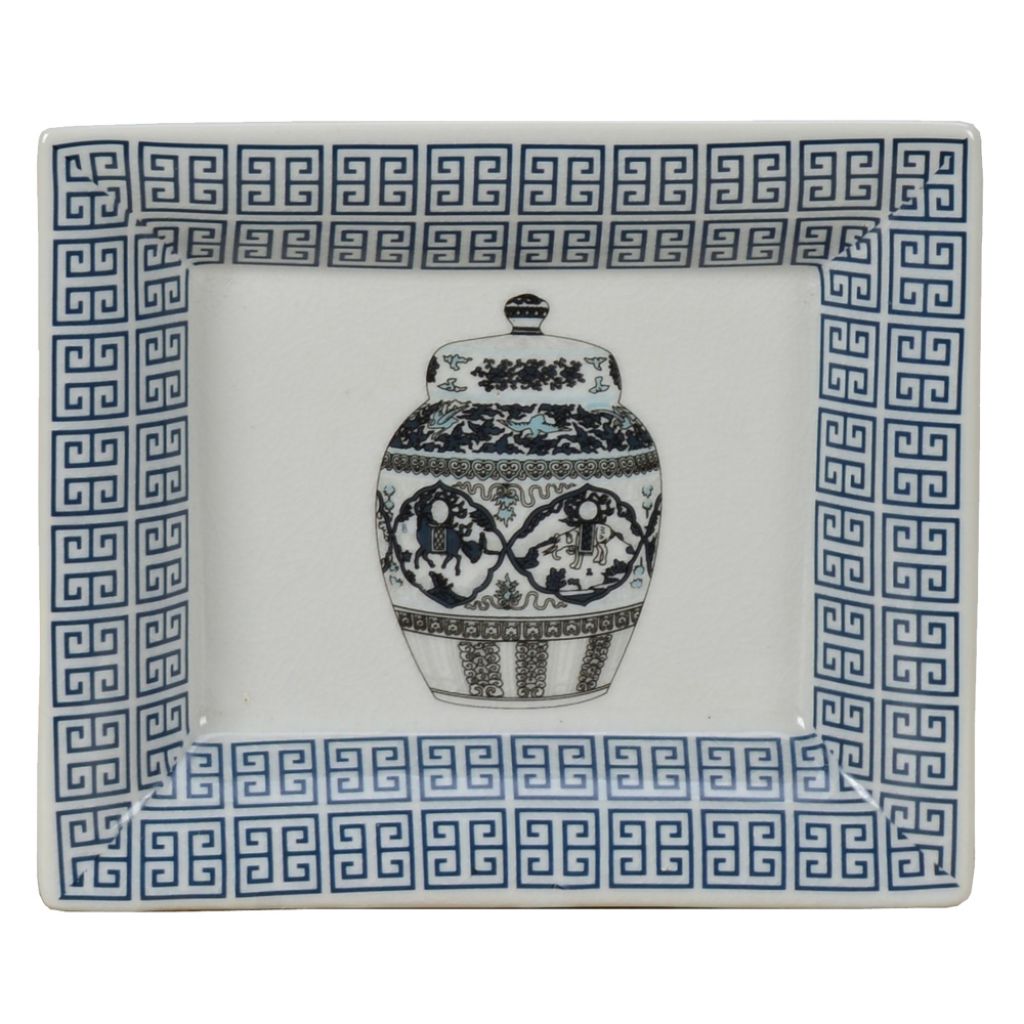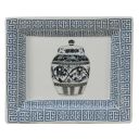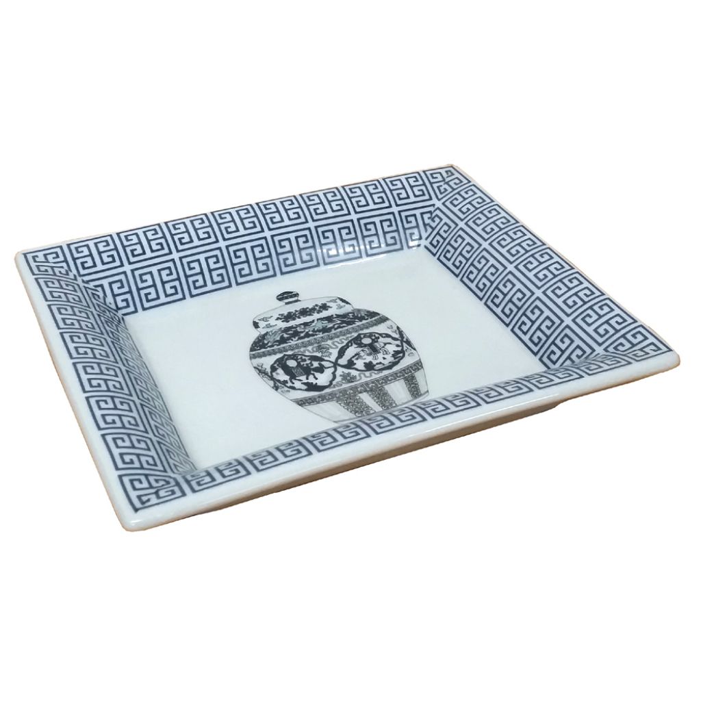 Porcelain Dish with blue motif decoration around sides and vase in centre.