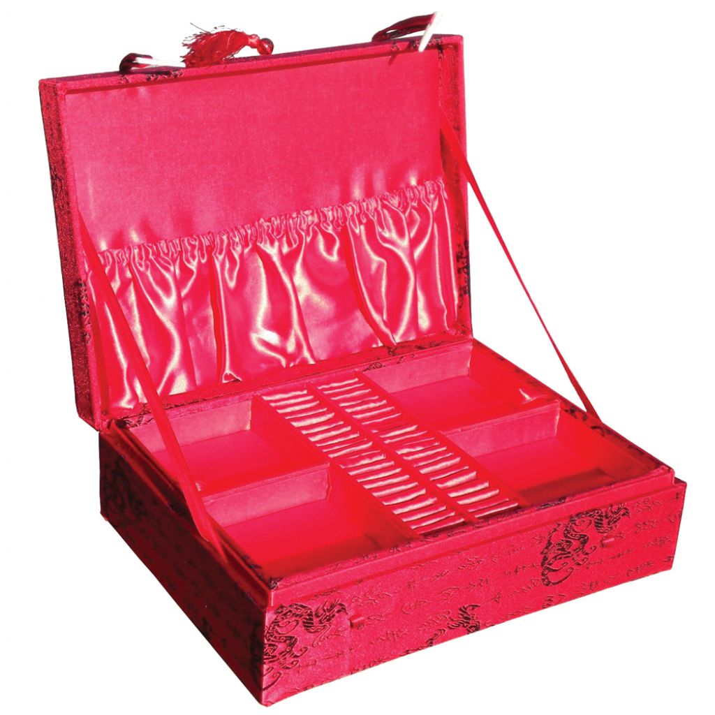 Brocade covered jewellery box in a sumptuous rich red silky brocade decorated with a pattern of dragons and characters in black. Finished inside in red faux silk, the main part is divided in to three compartments with a lift-out upper tray containing a further four compartments and ring holders. Also features a pocket for larger items beneath the lid and a tassel handle.