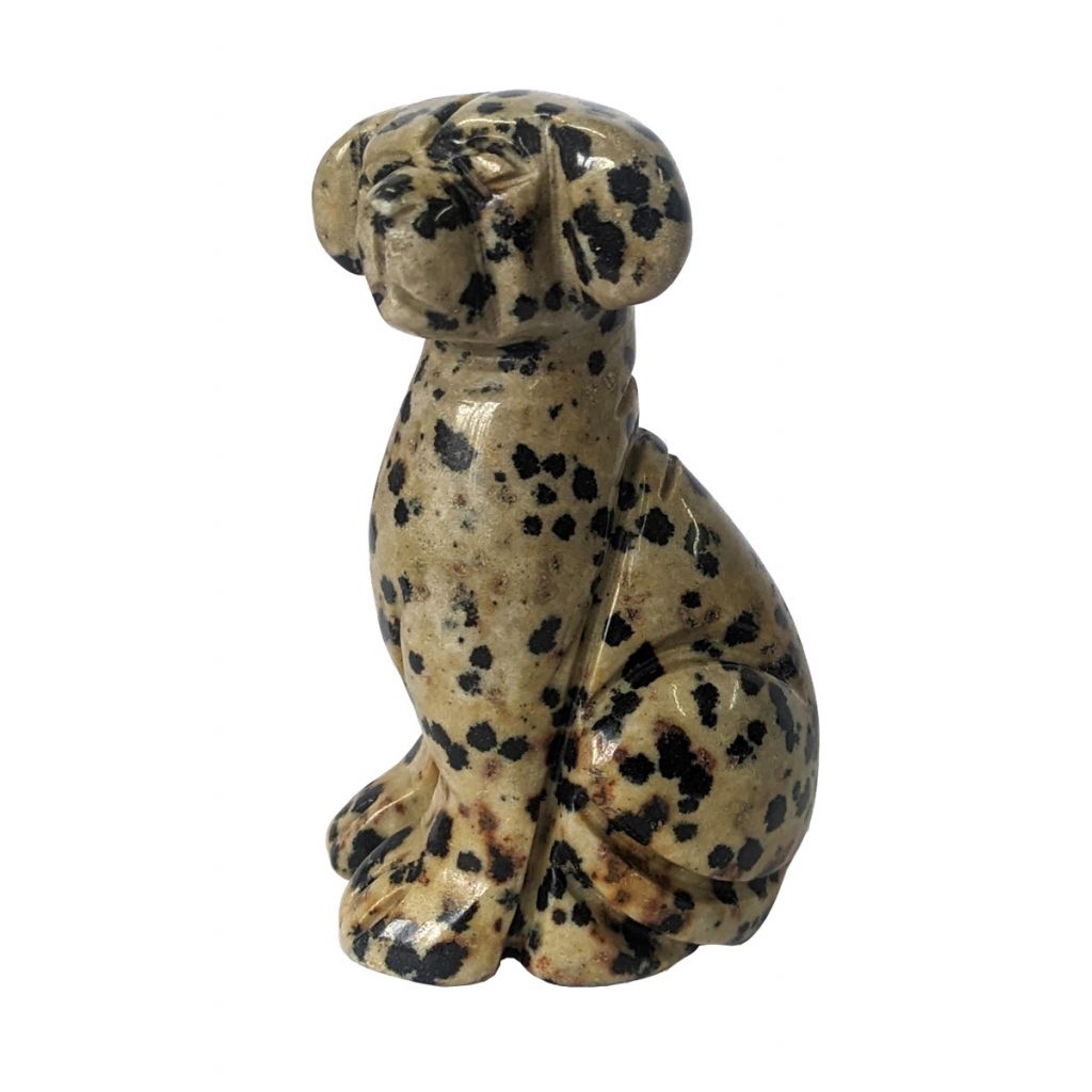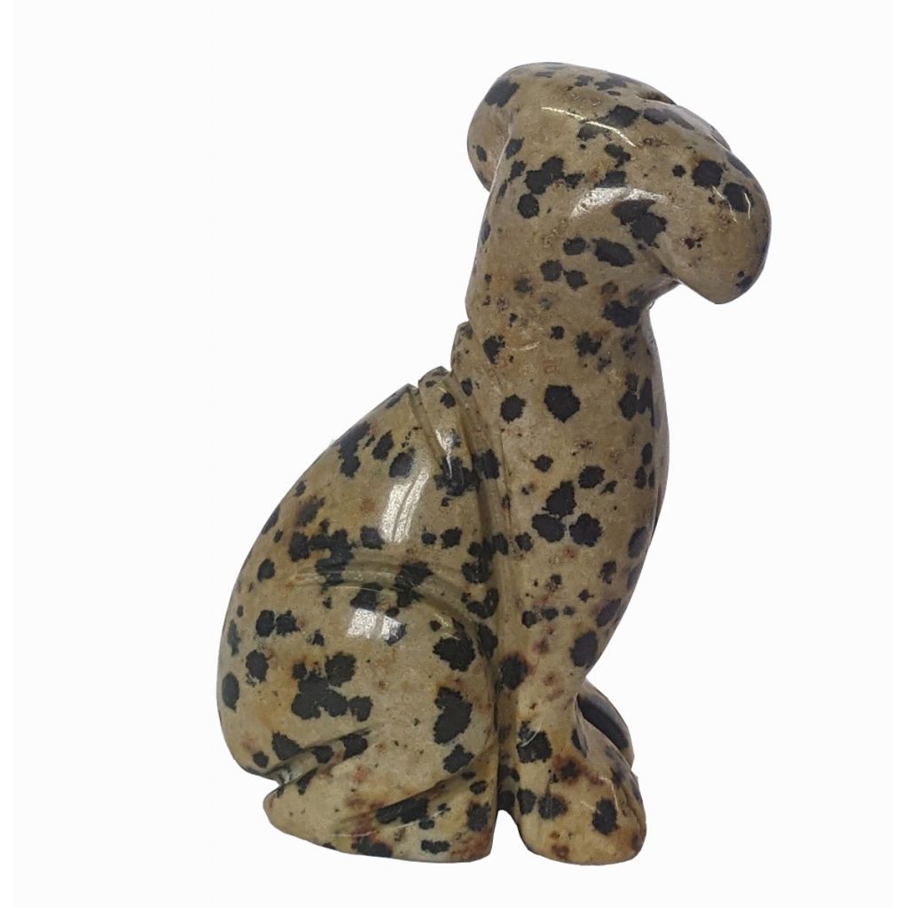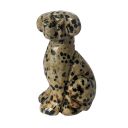 Polished figure of a upright and alert dog carved from a piece of dalmatian jasper stone. Each varies with the patterns in the spots of black and brown on beige.